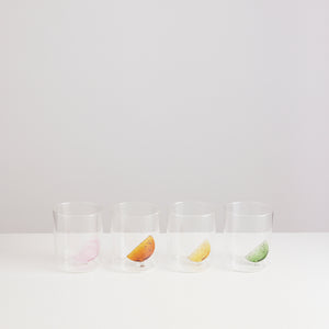 Here is a symphony of surreal citrus! Each gobelet holds in its heart an everlasting slice of fruit: a lemon, a lime, an orange and a grapefruit. Handcrafted from borosilicate glass, this set of four drinking glasses combine playful design with everyday function, perfect for water, cocktails or fresh juice. Together they make our dream orchard...